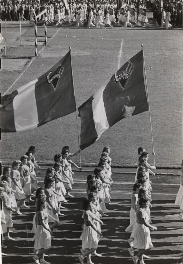 Спортивная демонстрация на стадионе «Динамо» во время празднования юбилея Москвы, Москва, 1947 год. Фотограф Роберт КапаПара танцует на улице во время празднования годовщины Москвы, Москва, 1947 год. Фотограф Роберт Капа