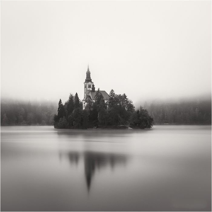Конечно же, фотограф не обошел вниманием и единственный остров в Словении. Черно-белое изображение участка земли у озера Блед с возвышающейся над ним церковью Успения Девы Марии остается одним из его любимых образов.
