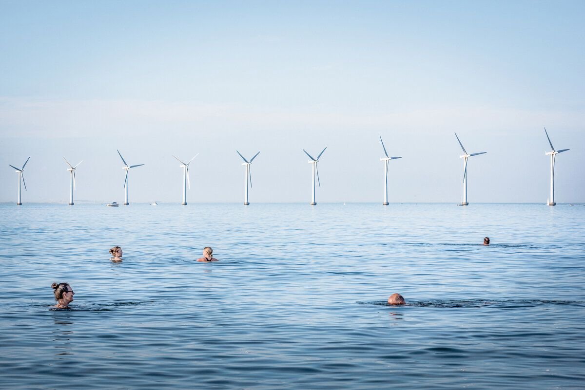 Фотограф документирует инновационные технологии, которые предлагают возможные пути достижения этих целей.Люди плавают в Амагер-Странд, Дания, 13 июля 2021 года, рядом с ветряной электростанцией, принадлежащей 8 552 потребителям электроэнергии и обслуживающей более 40 000 домохозяйств Копенгагена.