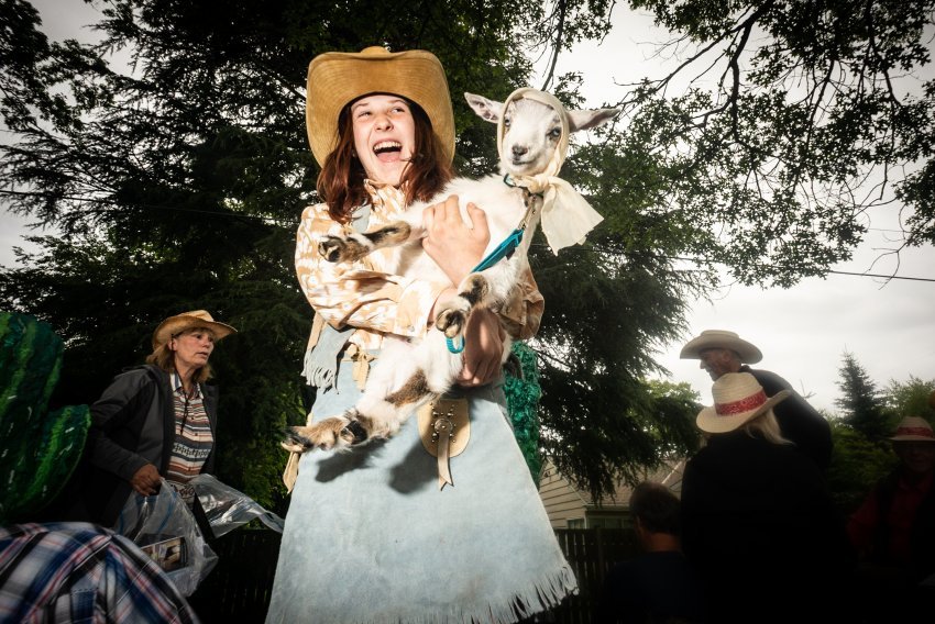 Для моей серии «Праздники в маленьком городе» я фотографировал праздники в небольших городках на северо-западе Тихоокеанского континента. Эта фотография была сделана 4 июля 2022 года в Седро-Вулли, штат Вашингтон, когда патриотичная ковбойша развлекалась с козой.